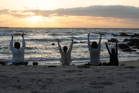 真っ正面に見える水平線から上がる朝陽を浴びて、眠りから覚めていく自然の息吹を感じながらヨガを味わっていきます